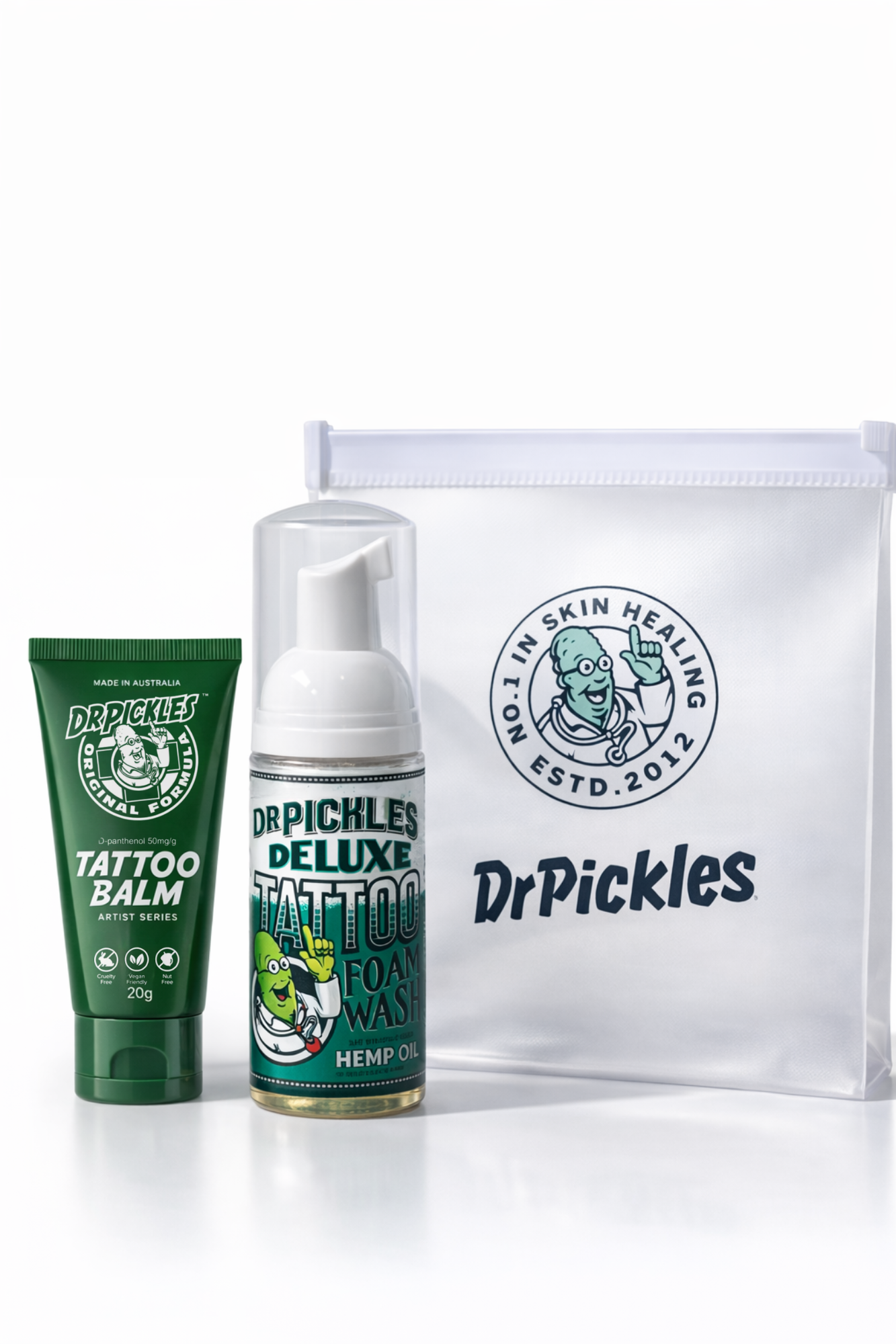 Stay fresh and protected on the move with the Dr Pickles Wash & Heal Travel Pack. This compact kit pairs our best-selling 50ml Antibacterial Foaming Tattoo Wash with your choice of healing essential: Vegan Balm (20g or 50g), Original Balm (75g), or Dermal Soothe Gel. Everything comes packed in a reusable case that slips easily into your bag, suitcase, or gym locker.